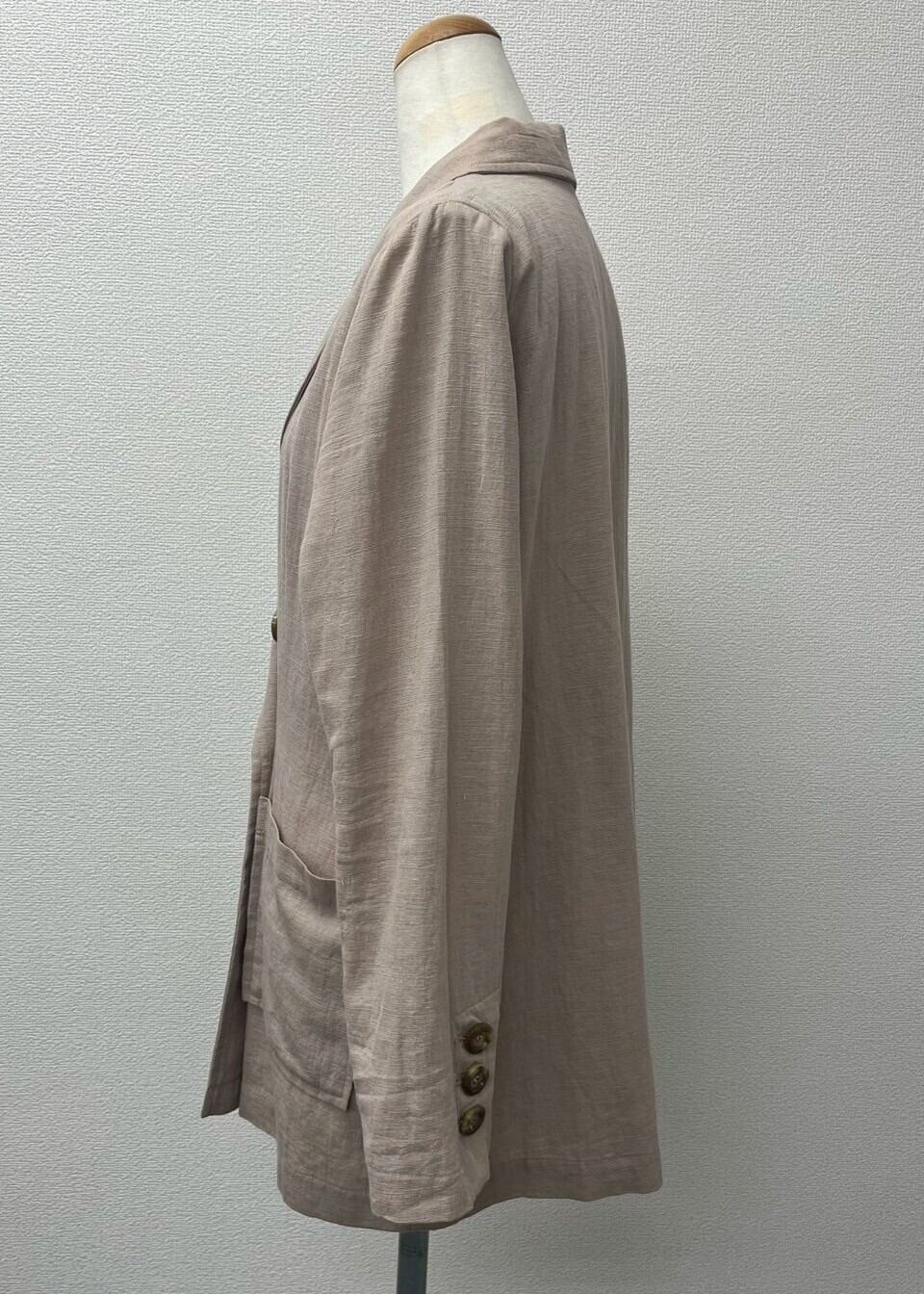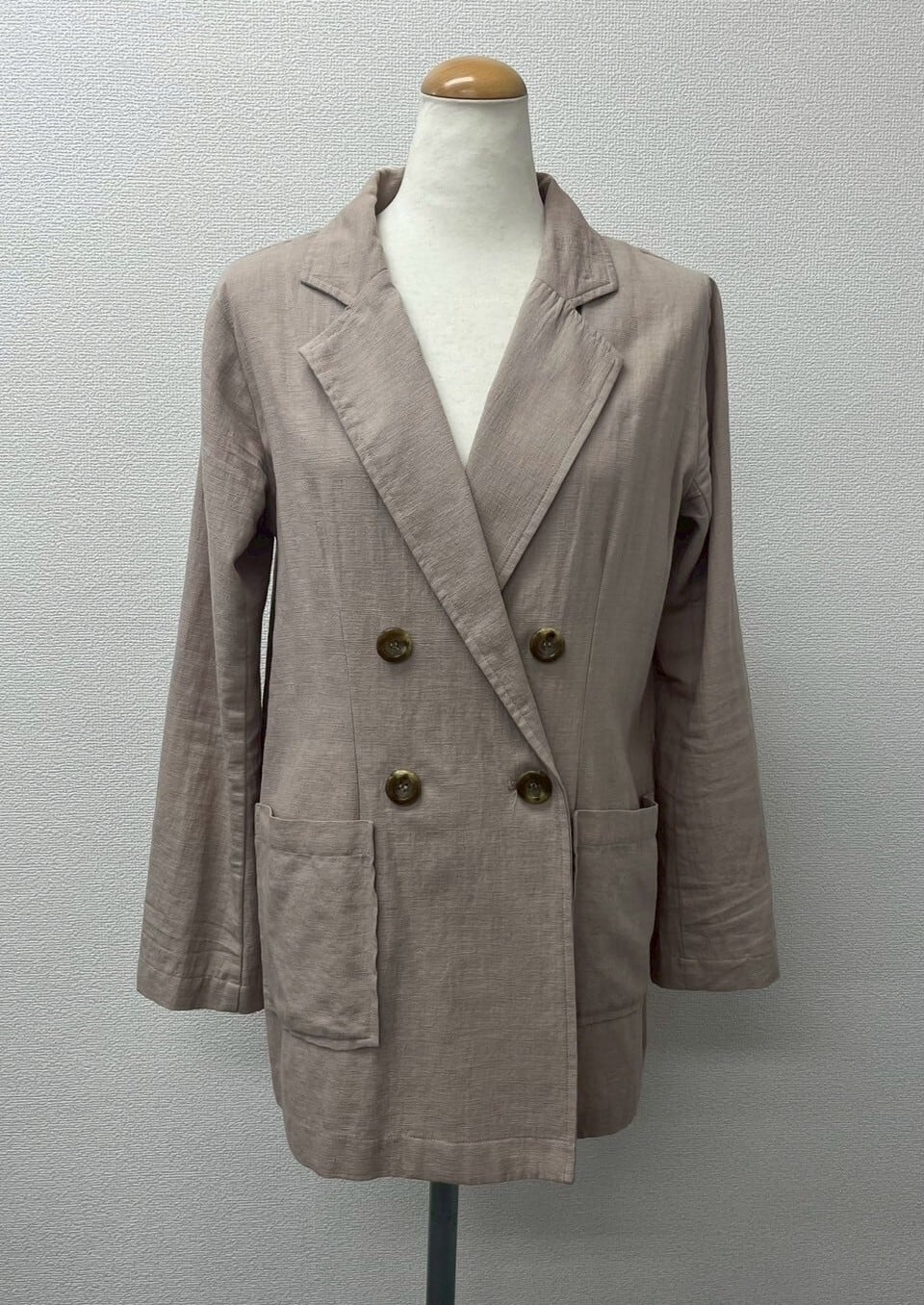 合わせた同系色のダブルジャケットは、軽やかな素材感と程よいゆとりで、かっちりしすぎず抜け感もプラス。セットアップ風に着ることで、統一感のある洗練されたスタイルが完成します。