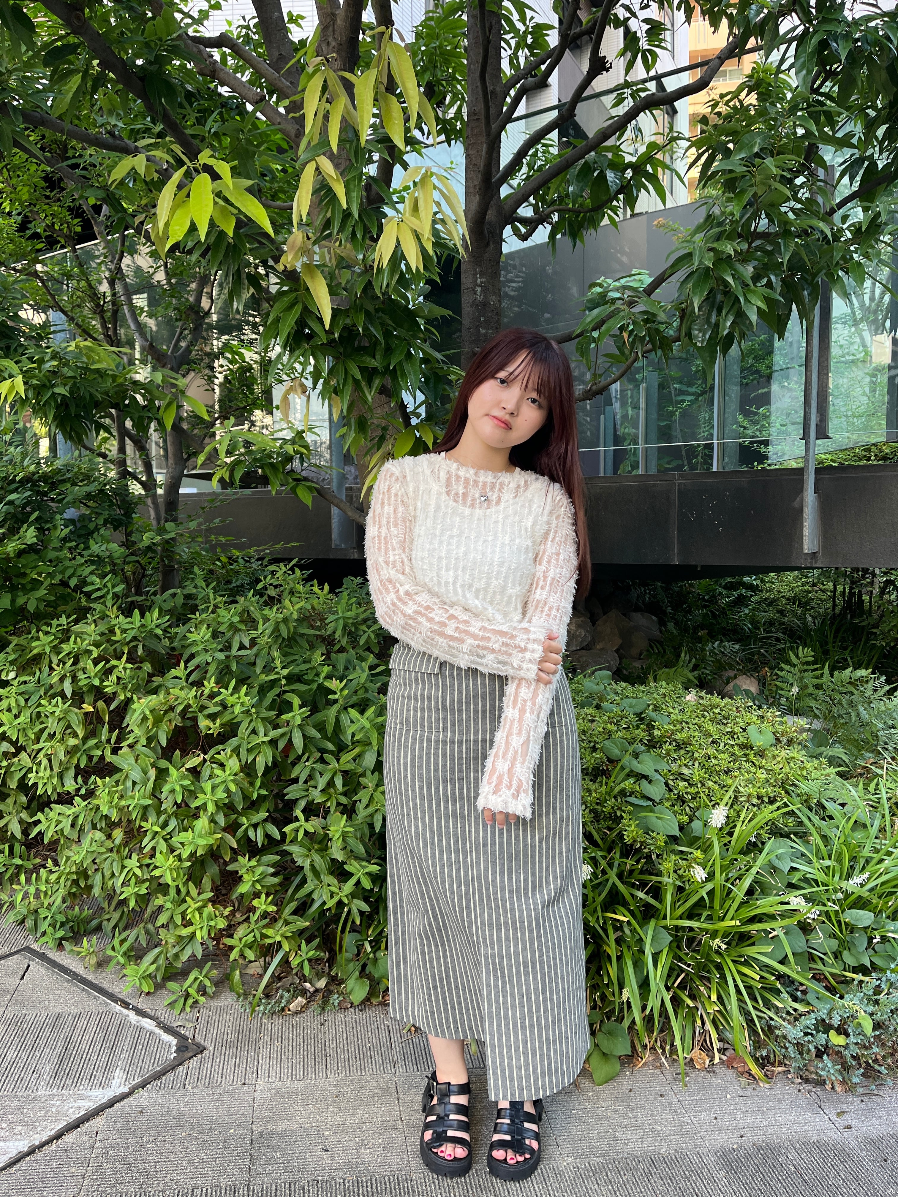 ニットの立体的な質感とストライプスカートの直線的な柄が対照的で、バランスの良いスタイルです。全体を淡いトーンでまとめているため、清潔感と女性らしさが際立ちます。